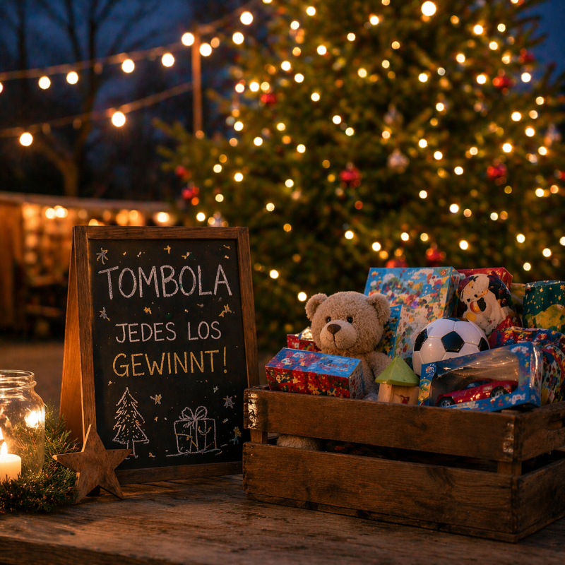 Wenn es draußen weihnachtlich wird und der Duft von Glühwein und gebrannten Mandeln durch Tagewerben zieht, dann ist es wieder Zeit für den Weihnachtsmarkt – und natürlich für unsere beliebte Spielzeugtombola!